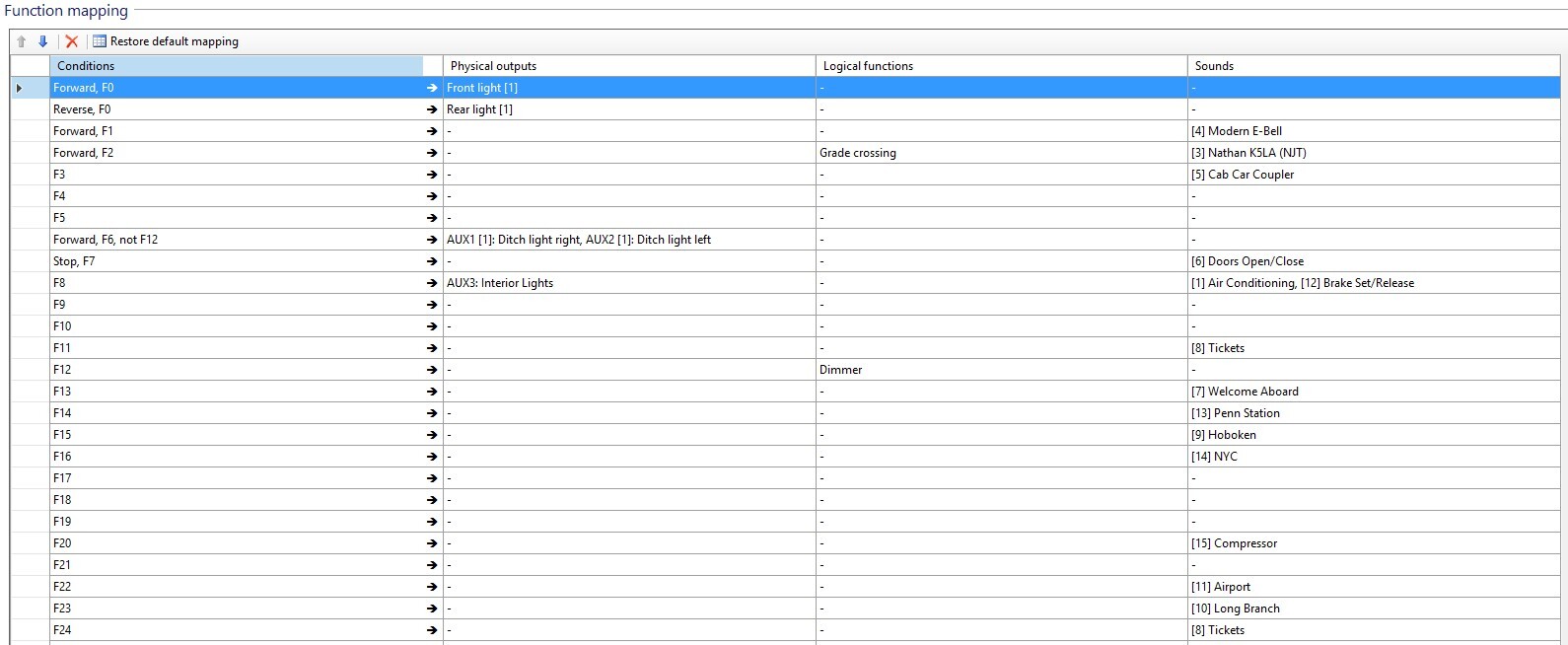 Here is the function mapping tab from LokProgrammer for reference.